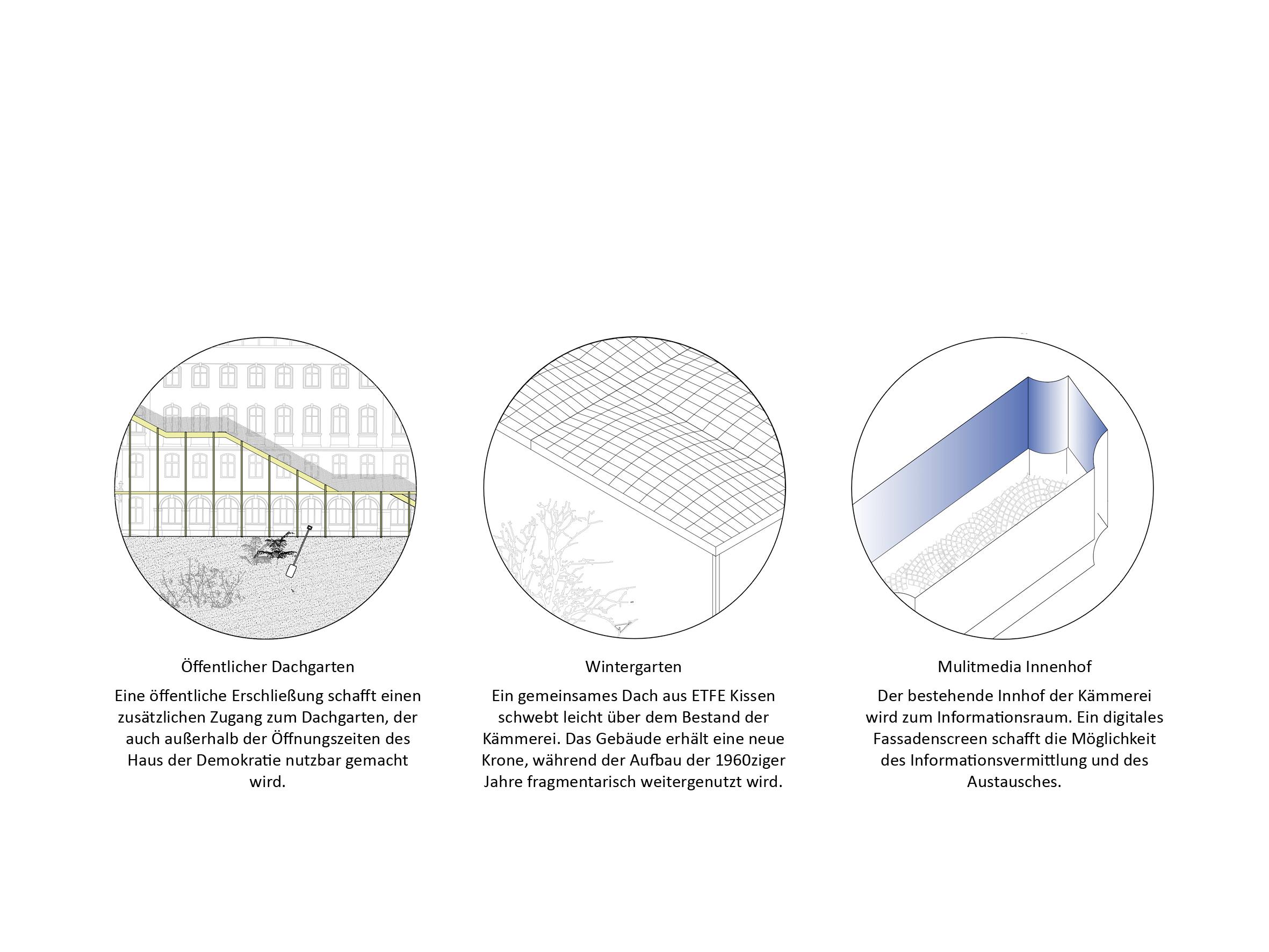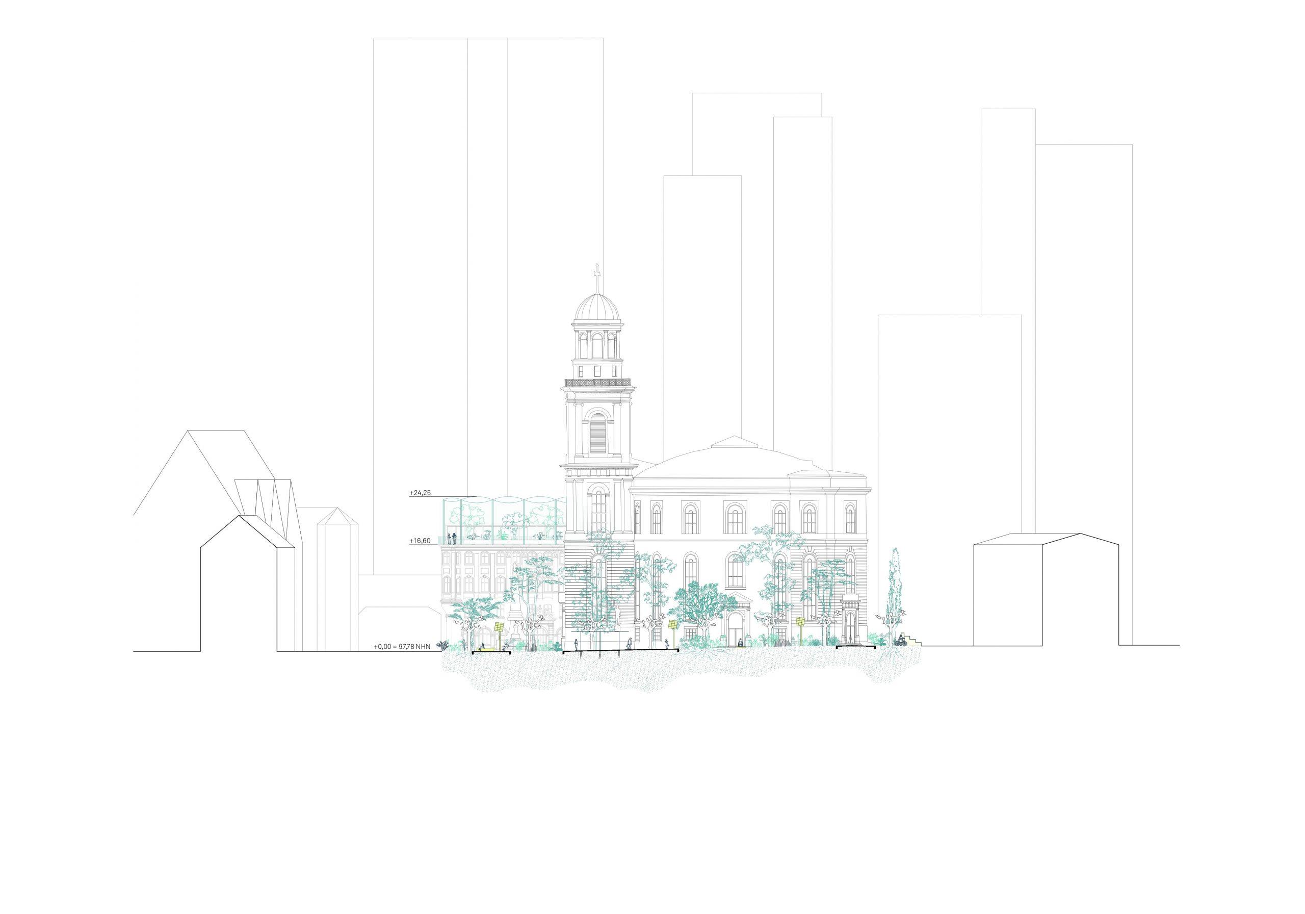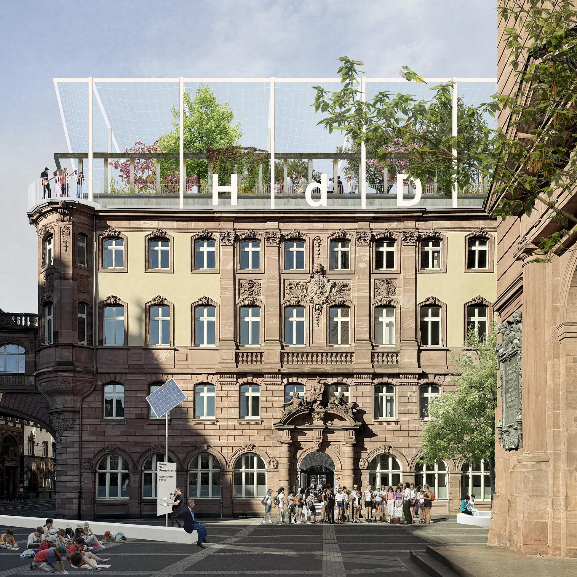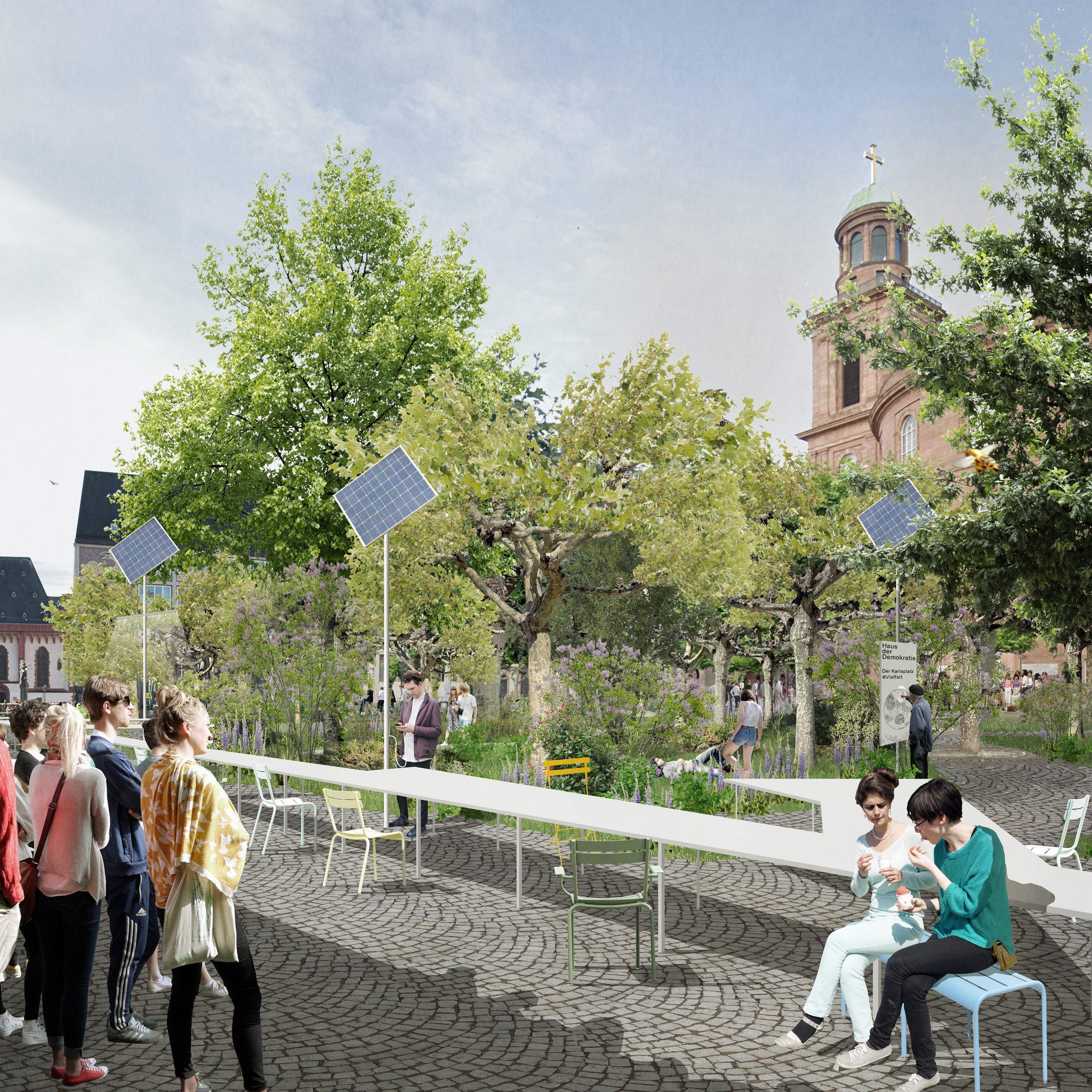 Der offene und kommunikative Raum macht Demokratie erlebbar und integriert gleichzeitig ökologische und nachhaltige Prinzipien in die Gestaltung. Die Umnutzung und Transformation des Bestandes von Paulsplatz und Kämmerei wird gegenüber einem Neubau priorisiert und berücksichtigt so die klimatischen Herausforderungen unserer Zeit. Das „Haus der Demokratie“ selbst wird ein dynamischer und offener Bau sein, der die vorhandene Struktur der ehemaligen Stadtkämmerei respektiert und sie für die neue Nutzung adaptiert. Als neue Krone erhält das Dach der Kämmerei einen öffentlich zugänglichen und multifunktional nutzbaren Wintergarten.
