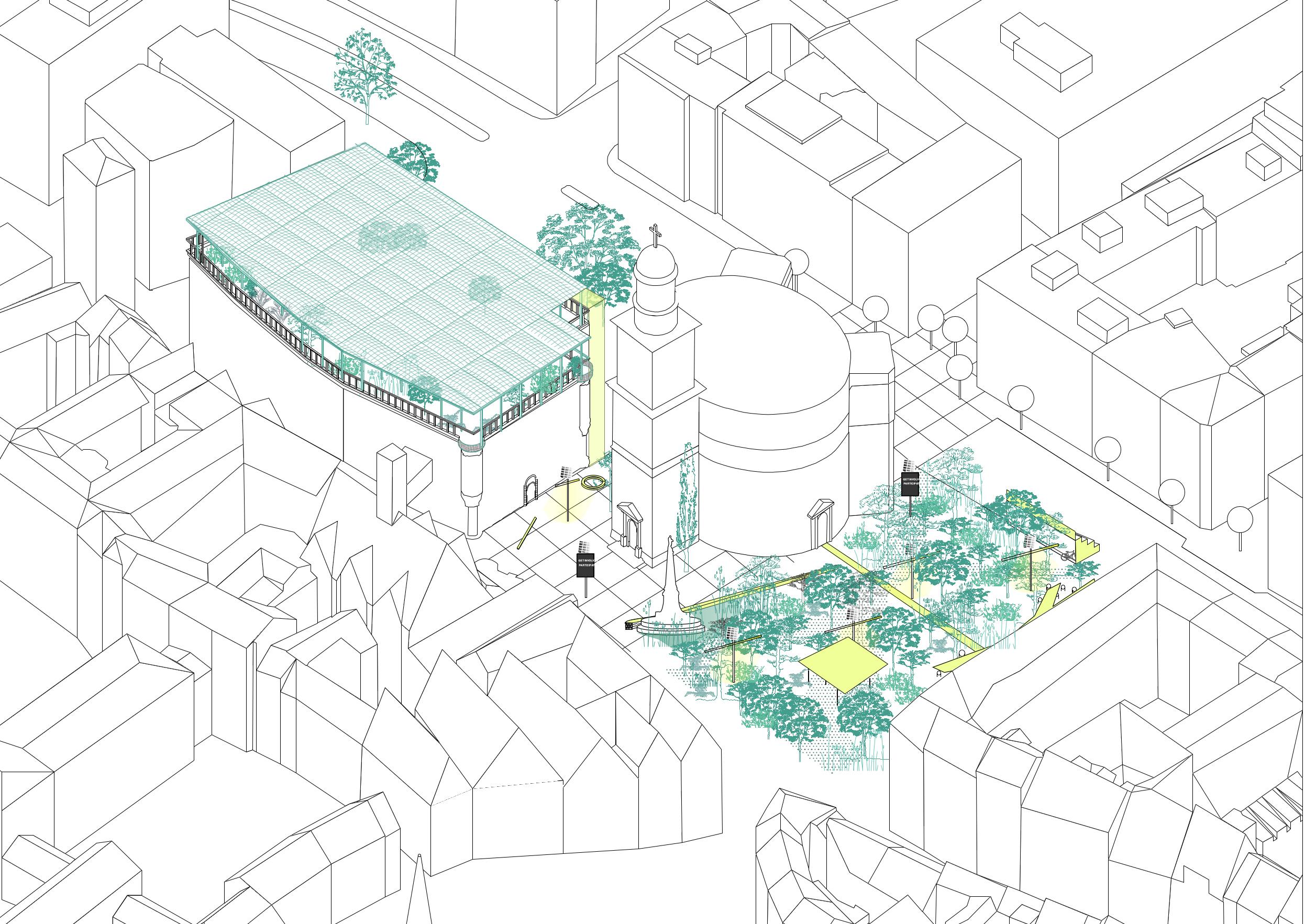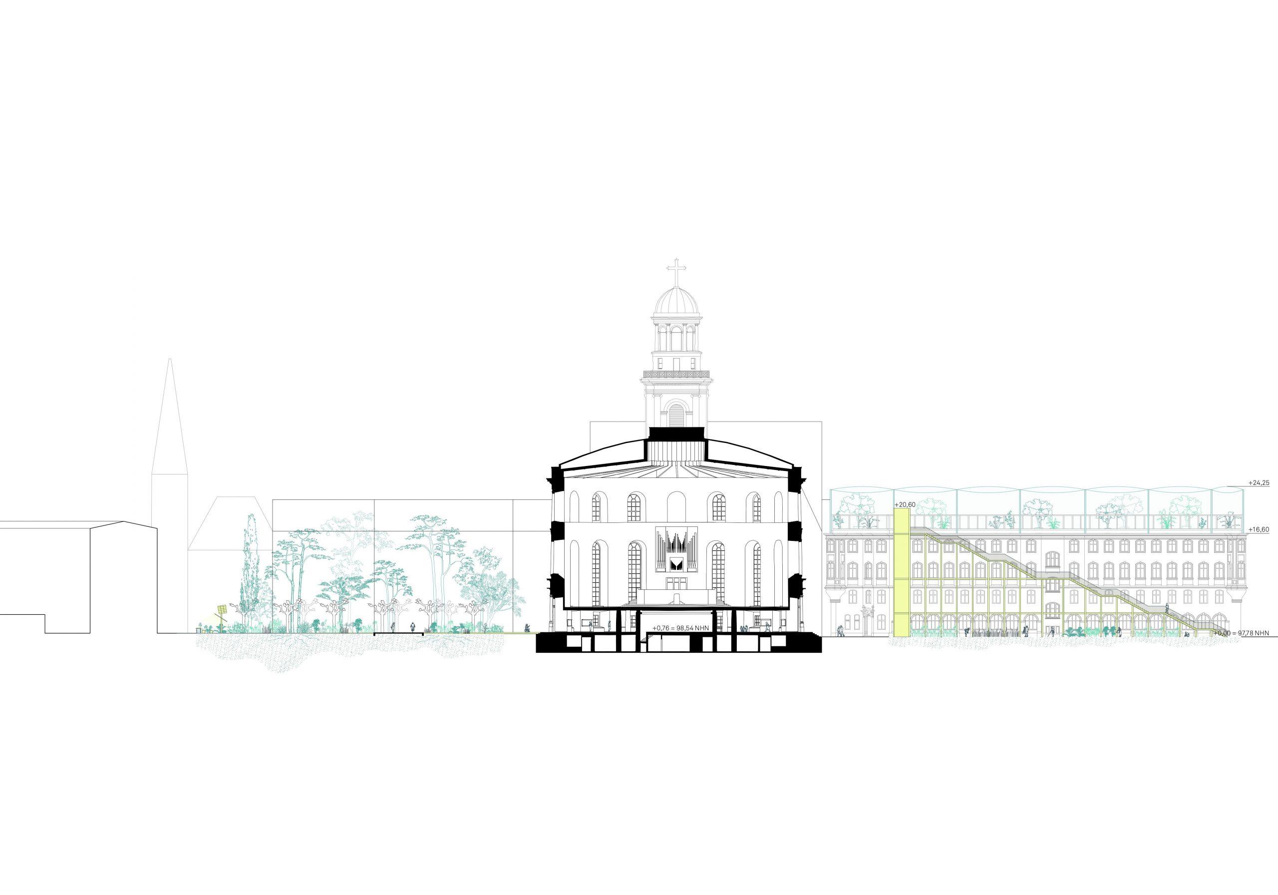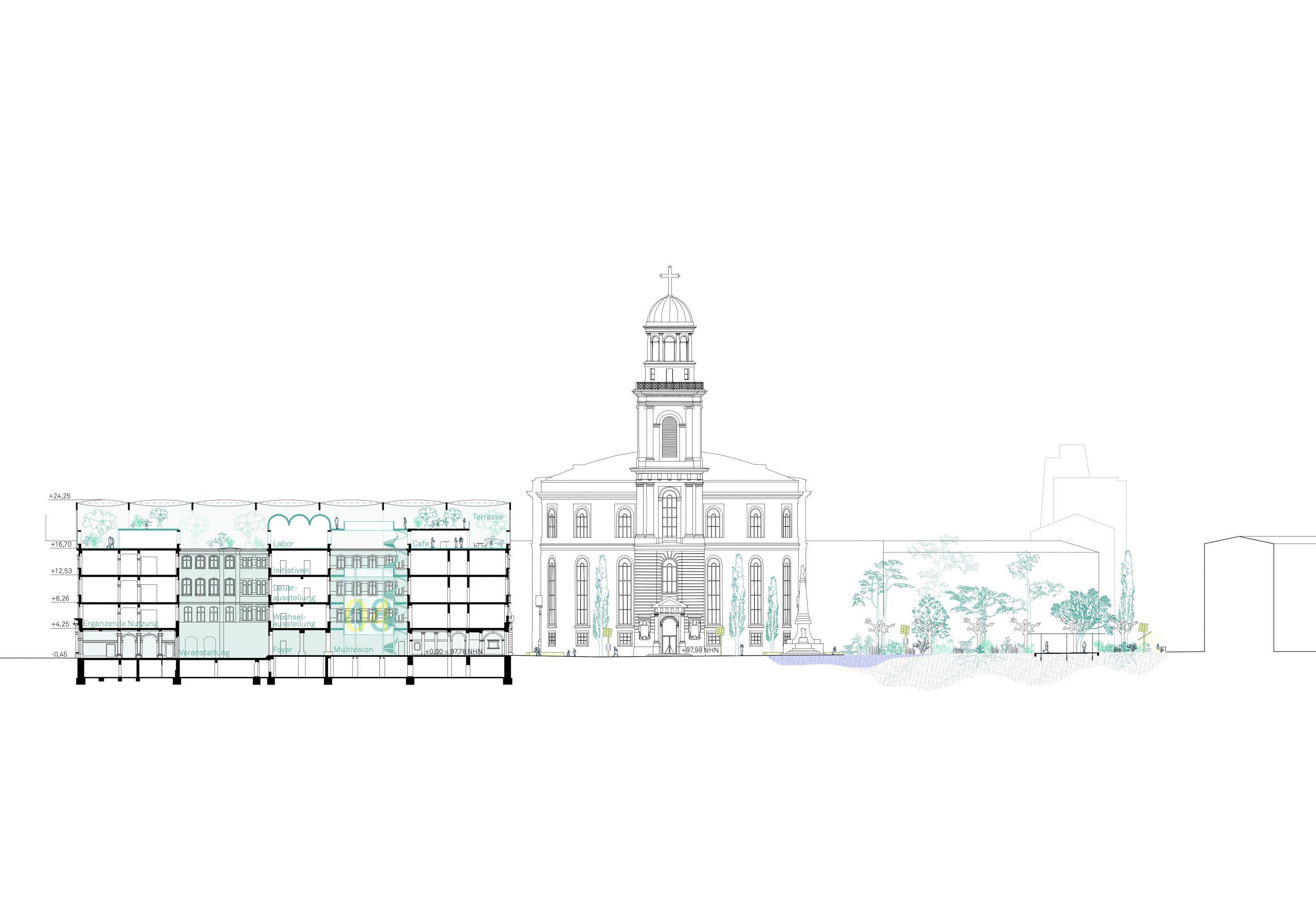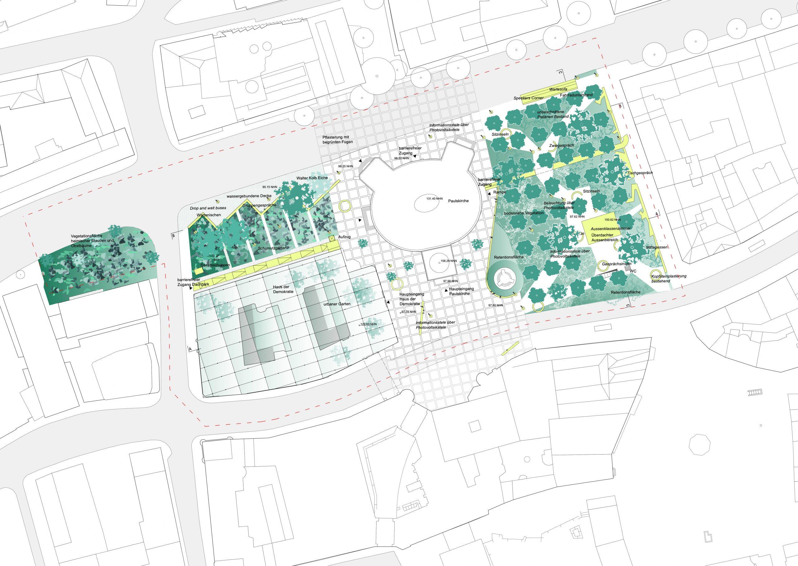 Der offene und kommunikative Raum macht Demokratie erlebbar und integriert gleichzeitig ökologische und nachhaltige Prinzipien in die Gestaltung. Die Umnutzung und Transformation des Bestandes von Paulsplatz und Kämmerei wird gegenüber einem Neubau priorisiert und berücksichtigt so die klimatischen Herausforderungen unserer Zeit. Das „Haus der Demokratie“ selbst wird ein dynamischer und offener Bau sein, der die vorhandene Struktur der ehemaligen Stadtkämmerei respektiert und sie für die neue Nutzung adaptiert. Als neue Krone erhält das Dach der Kämmerei einen öffentlich zugänglichen und multifunktional nutzbaren Wintergarten.