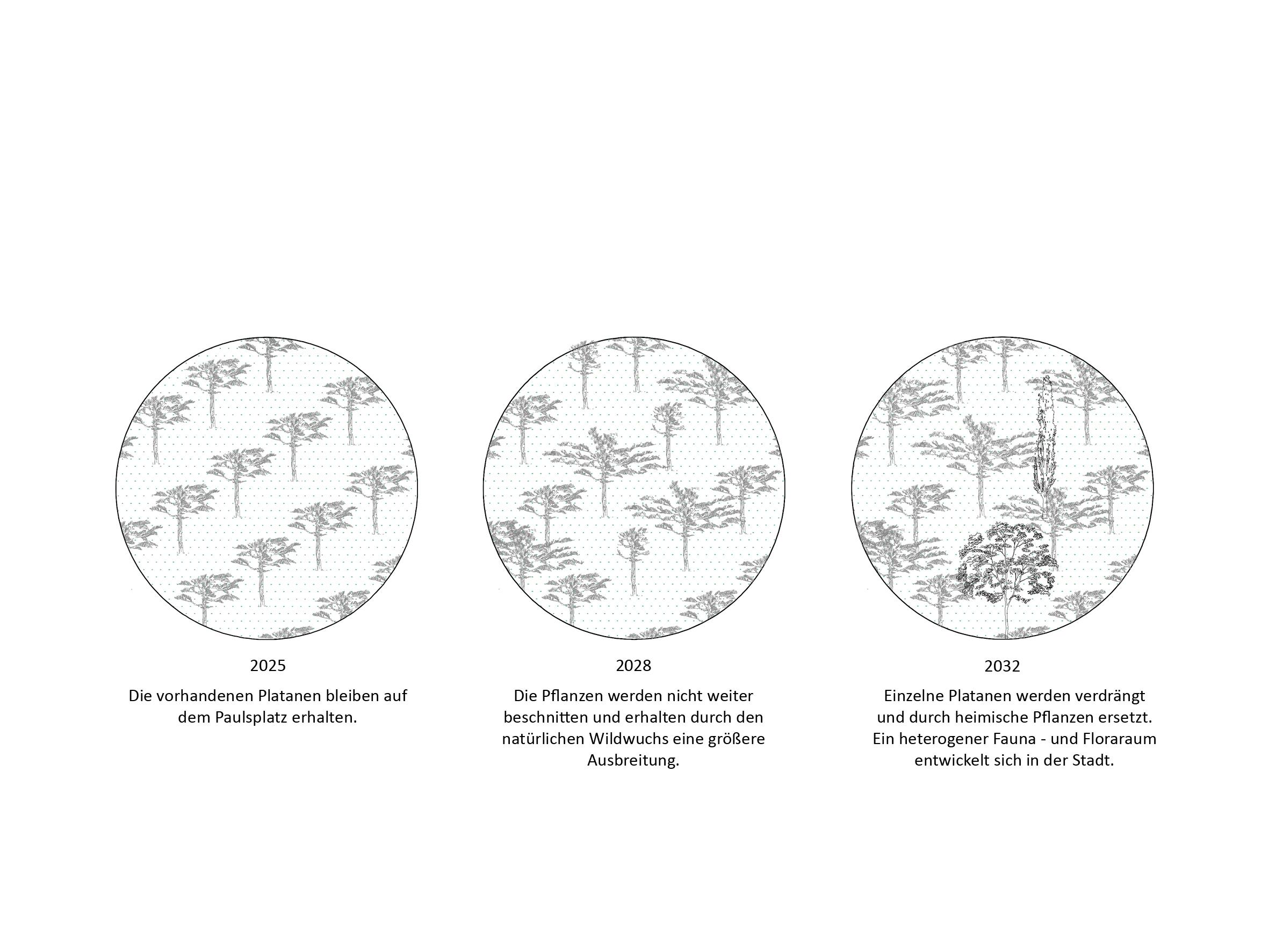 Der Paulsplatz wird zum urbanen Biotop, bei dem Flora und Fauna sich Platz und Raum zurückerobern können. Der Platz bedarf kaum Pflege, sondern folgt den Gesetzen einer klimaresilienten, natürlichen Bepflanzung.