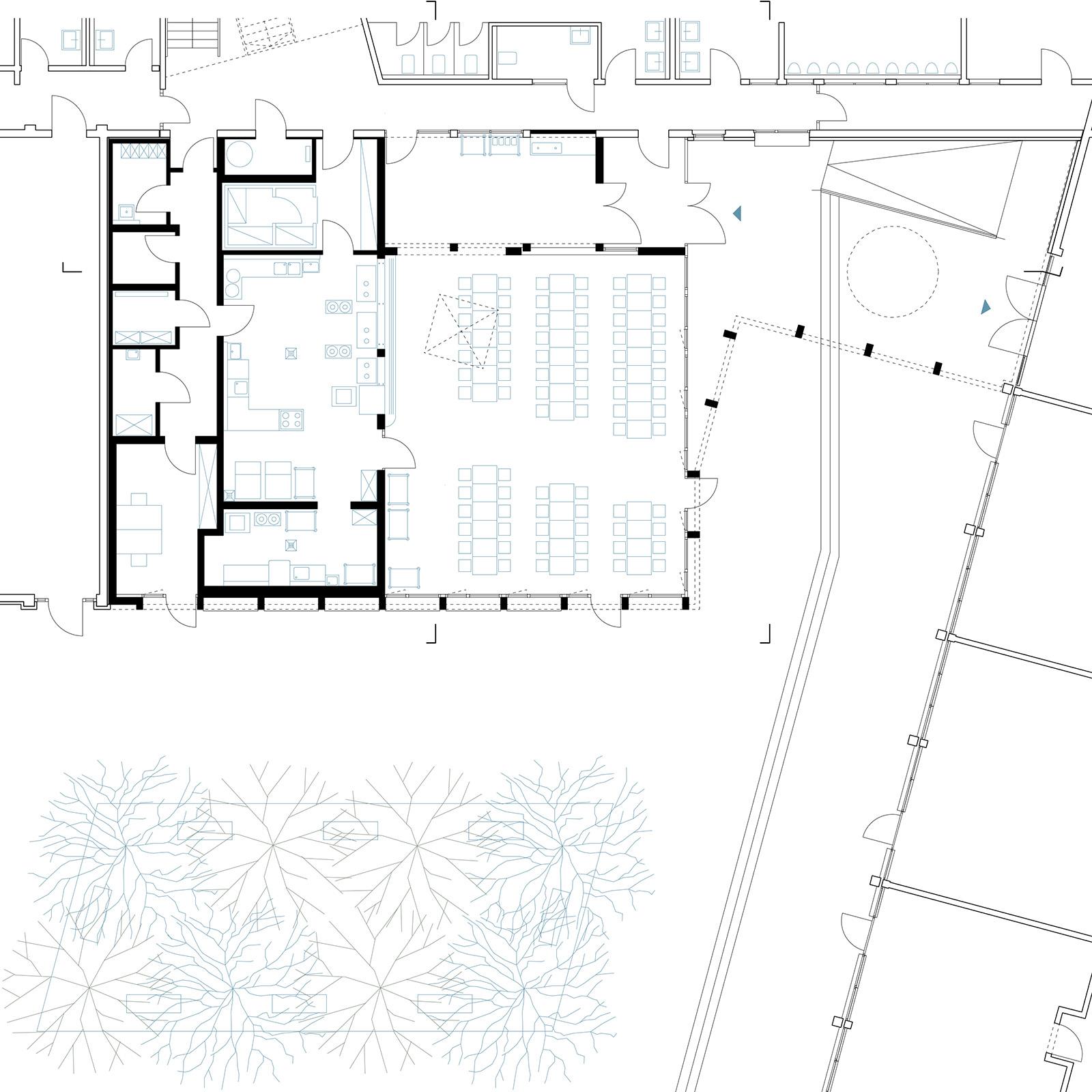Zwischenraum – Der Mensaneubau der Grundschule Ernstbergstraße ist als eingeschossiger Verbindungsbau zwischen den Bauteilen Turnhalle und Klassentrakt des Bestands konzipiert. Er schließt auf der Ebene des Pausenhofs im Süden und Westen direkt an den Bestand an, während die Ostseite mit einem großen Vordach angebunden wird. Die offene Seite grenzt direkt an den weiträumigen Pausenhof an.